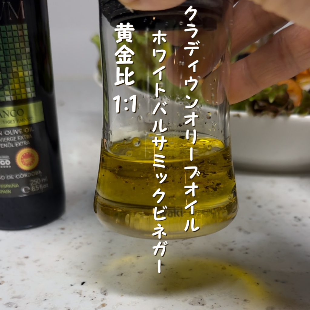 オリーブオイルのフレッシュさと、白バルサミコの自然な甘みが重なって、サラダがごちそうになります。
