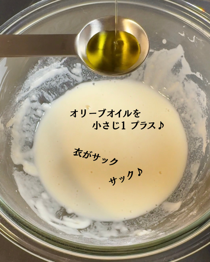 たったこれだけで、衣が軽くなり、サクッとした食感に仕上がります。