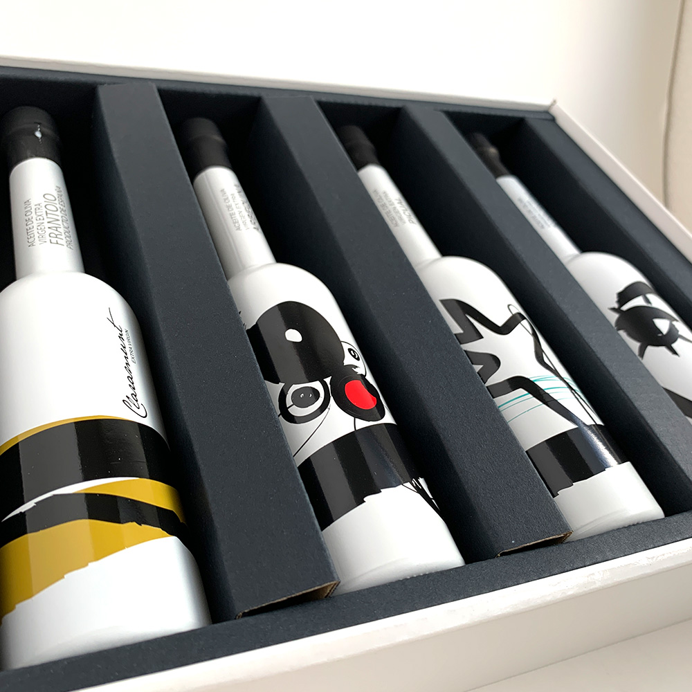 クララムントのパッケージは各オリーブ種のイメージと20世紀スペイン抽象絵画のイメージに合わせ、世界で活躍中のスペインのデザイナー、アナ・カベージョがデザインしました。